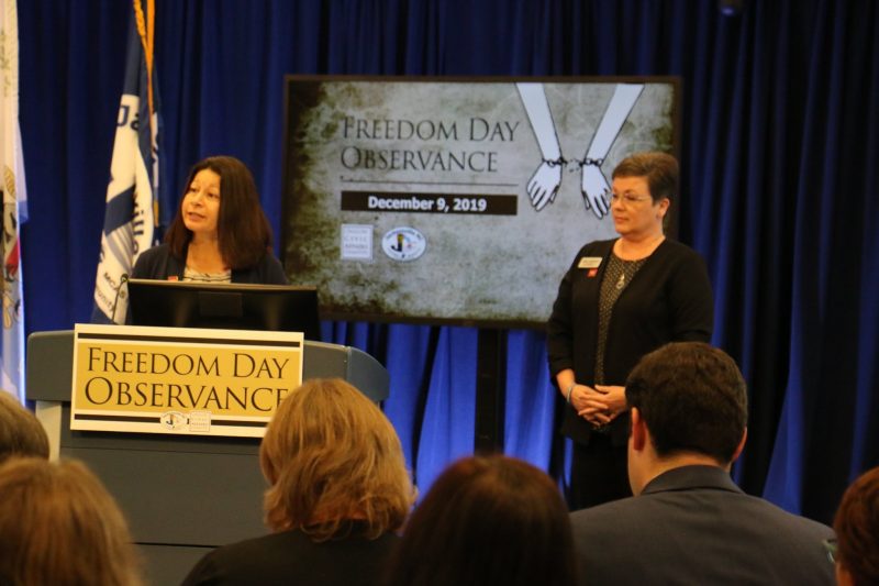 Cindy presents a proclamation at an event to promote awareness and remember victims of abuse.