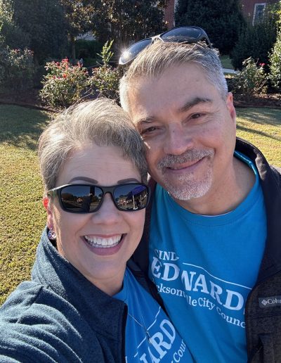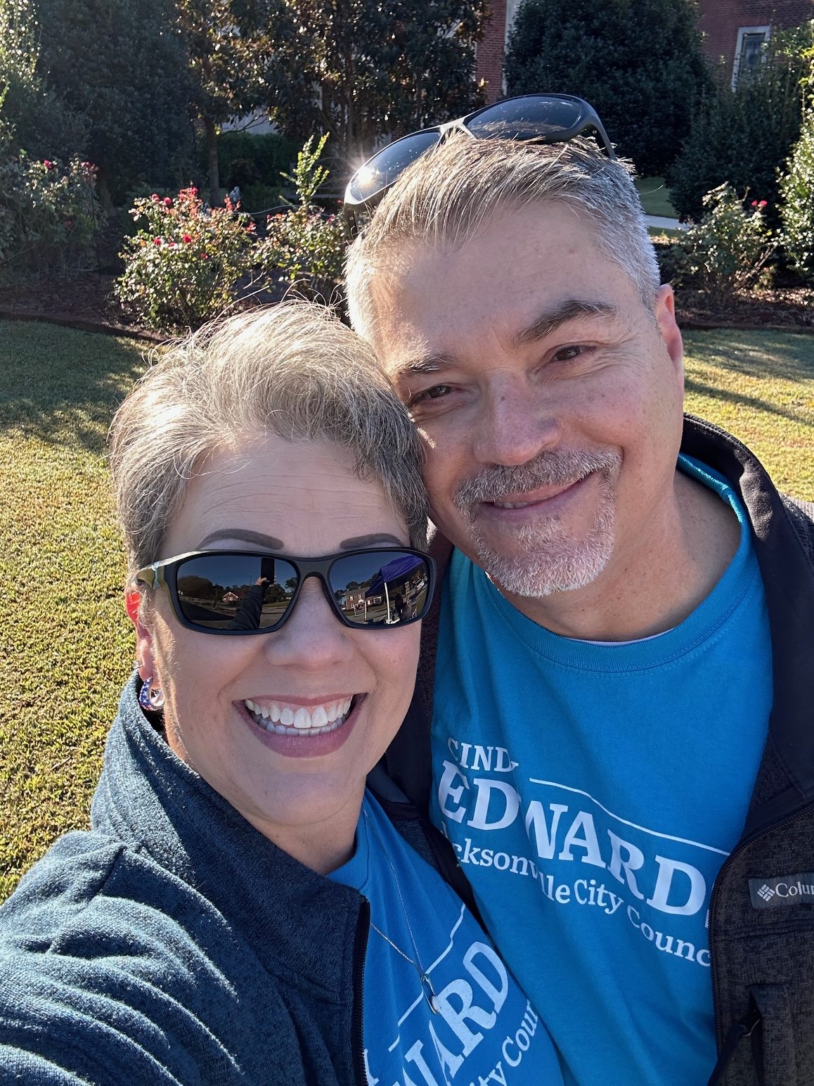 Cindy with husband, Greg, at polls on Election Day 2025.
